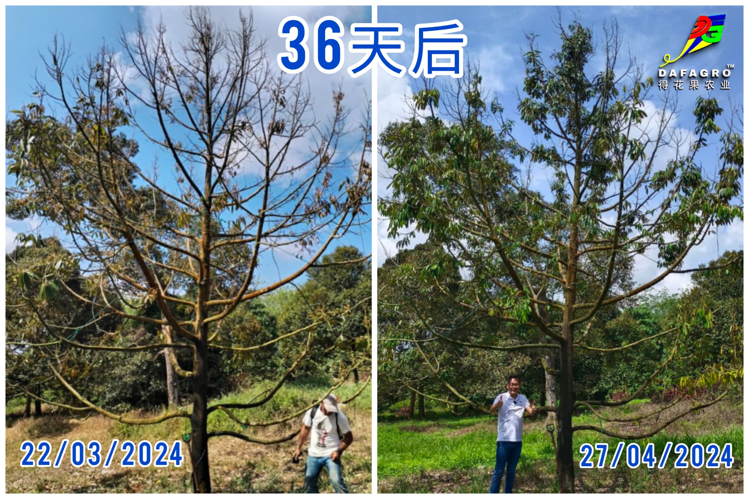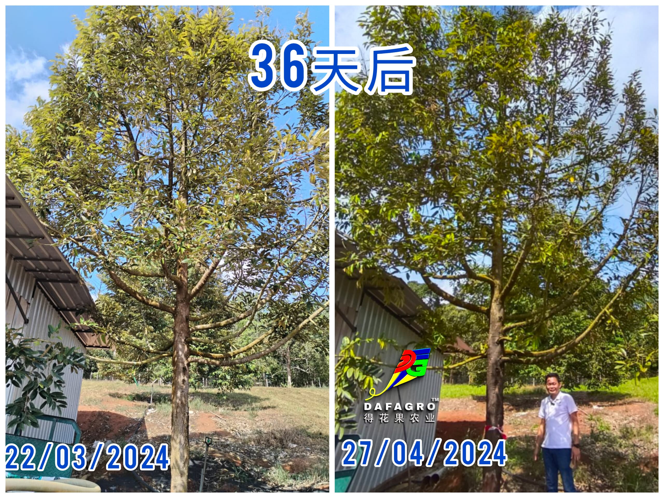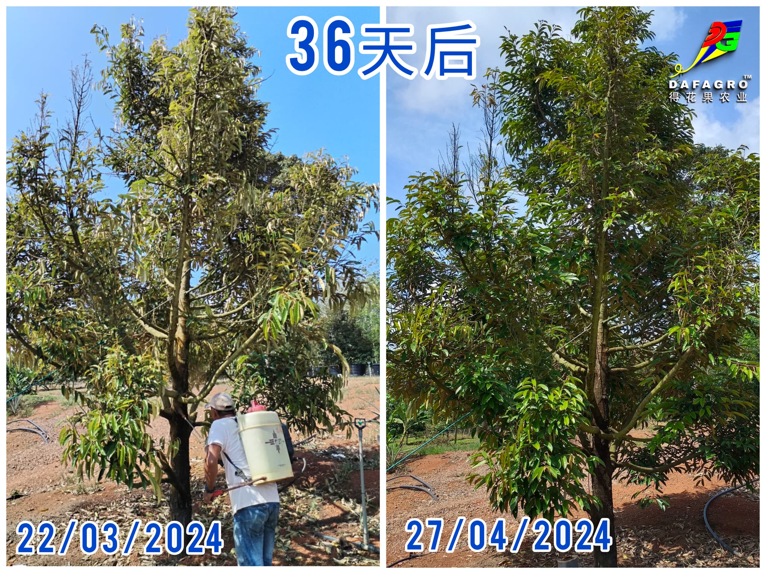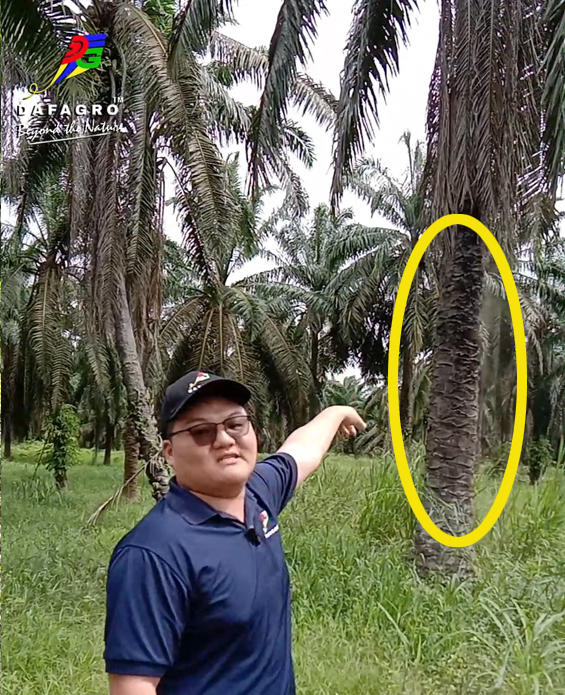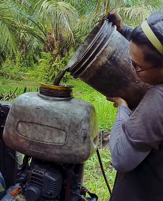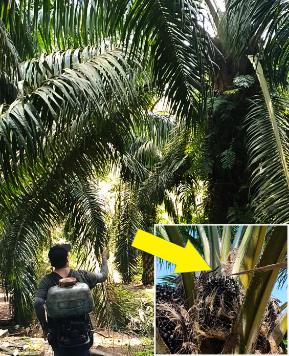 4. 我们的喷洒团队将在大约10年以下树龄的油棕树上喷洒得花果肥在树冠上。
