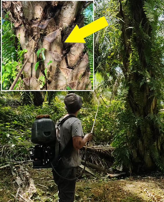 6. 对于未脱落的油棕树壳,我们的喷洒团队将专注于叶壳的缝隙处进行喷洒。