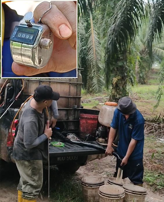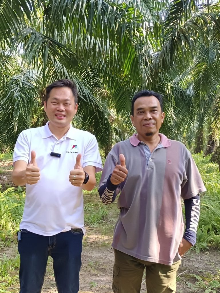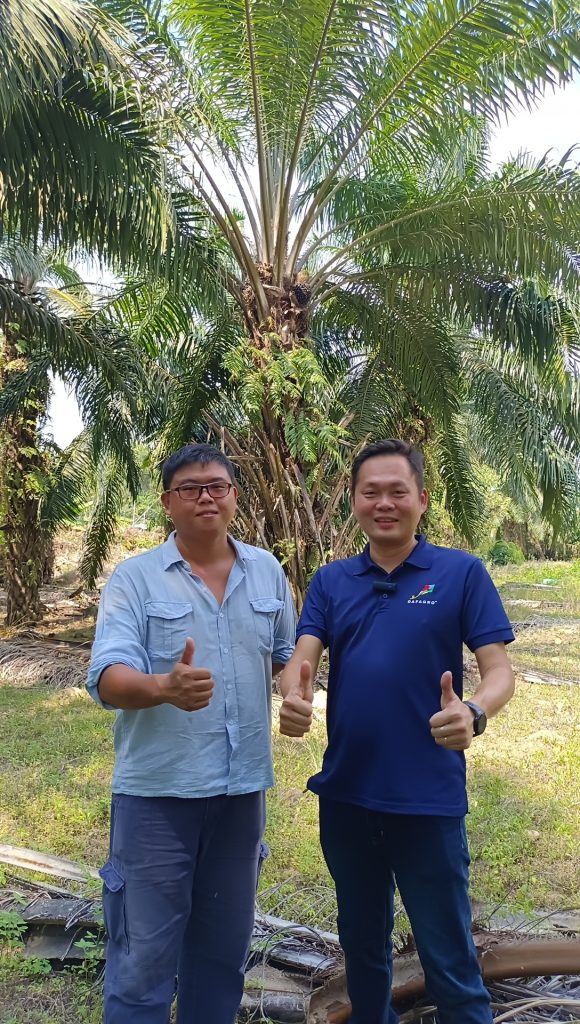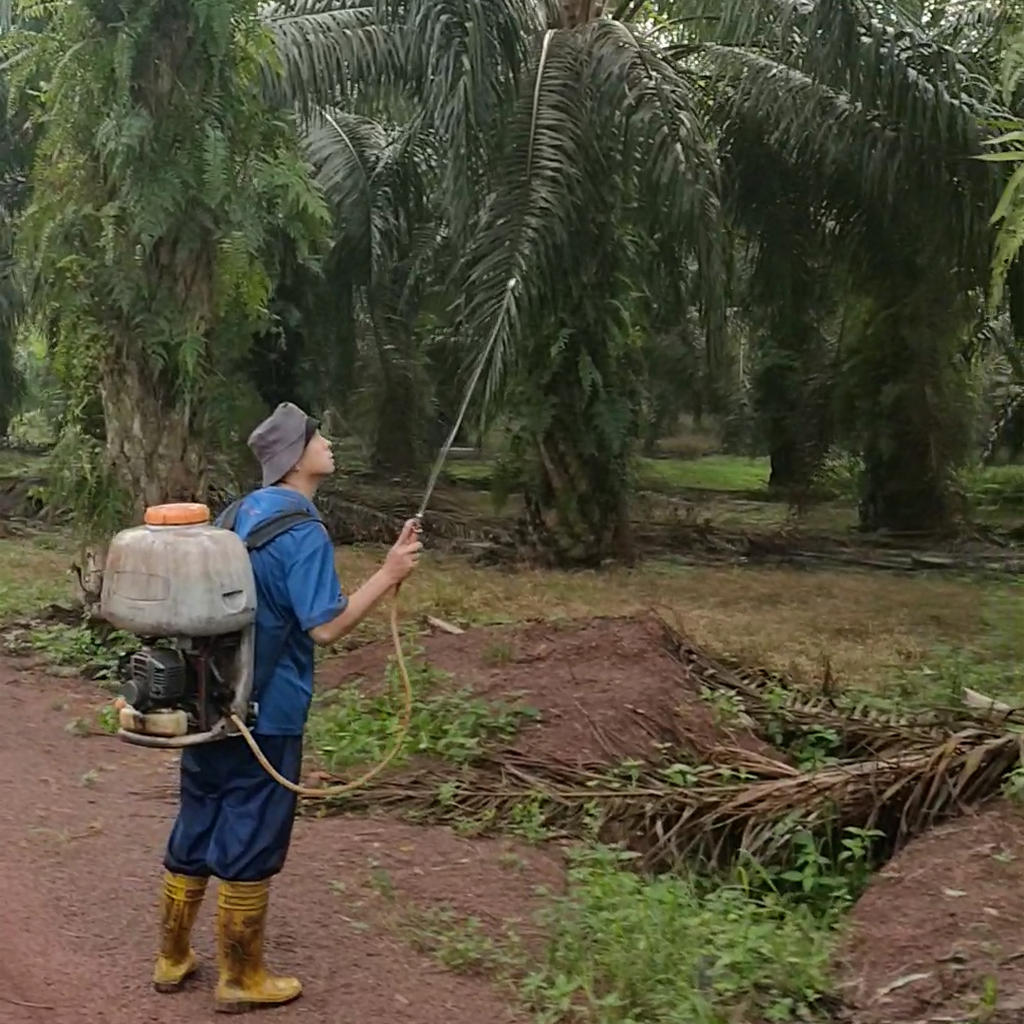 4. 我们的喷洒团队将在大约10年以下树龄的油棕树上喷洒得花果肥在树冠上。